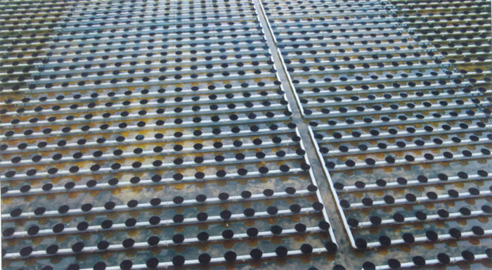 曝气器尺寸I型D=215MM,Ⅱ型D=260MM,曝气膜片运行平均孔隙80-100μm,空气流量1.5-3m3/个·h,服务面积I型O.25-0.5m2/个、Ⅱ型0.35-75m2/个,氧利用率(水深3.2m)18.4%-27.7%,充氧力0.112-0.185KgO2/m3.h,充氧动力效率4.46-5.19KgO2/KW.h,曝气阻力2.75Kpa。空气管设计应考虑压力平衡,最好联成环网,每组进气支管应设置阀门,便于调节空气量。 空气管设计流速: 干管为lO-15m/s;支管为5m/s曝气管表面距池底安装高度为:I型250MM,Ⅱ型270MM,推板式为200MM。